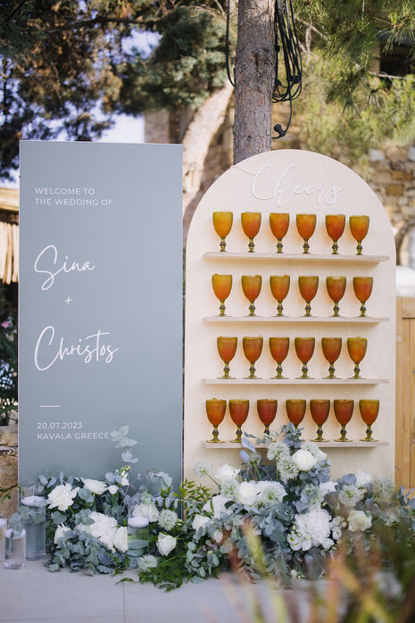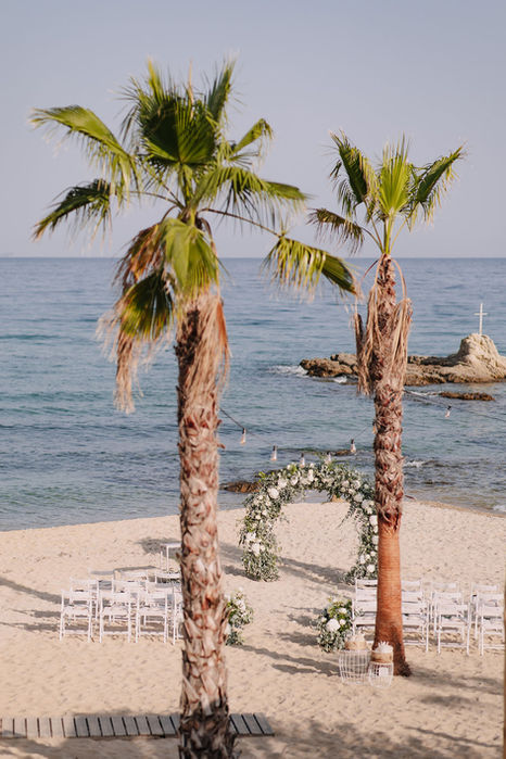 Sina and Christos travelled from Germany to exchange vows on the beach under the sunset. Their intimate beach wedding ceremomy and reception took place at Almyra beach bar in Kavala. Sina wanted a minimal chic approach in wedding design, so we designed a natural palette of textures and colors implemented in ceremony looks and reception tablescape.